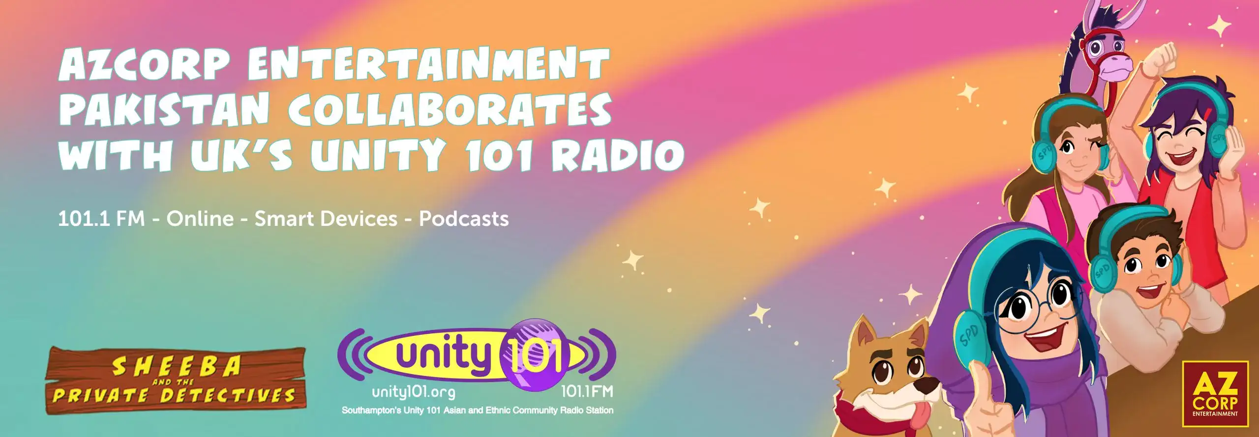 Unity 101 in association with Azcorp Entertainment Pakistan presents Audio Series “Sheeba & the Private Detectives” stories every Monday to Friday at 2pm. “We are really delighted to form partnership with a cooperation whose ideals are the same as Unity 101 Radio” said Ram Kalyan “Kelly”  HonDArts, the project and Station Manager of Unity 101 Radio, Southampton UK.  “Proud and excited to partner with Unity 101 for bringing adventures of Sheeba and the Private Detectives to the children in the UK, So pleased to see our comic book characters going global, three cheers to Unity 101 for making this happen” said Imran Azhar Chief Executive Officer , Azcorp Entertainment