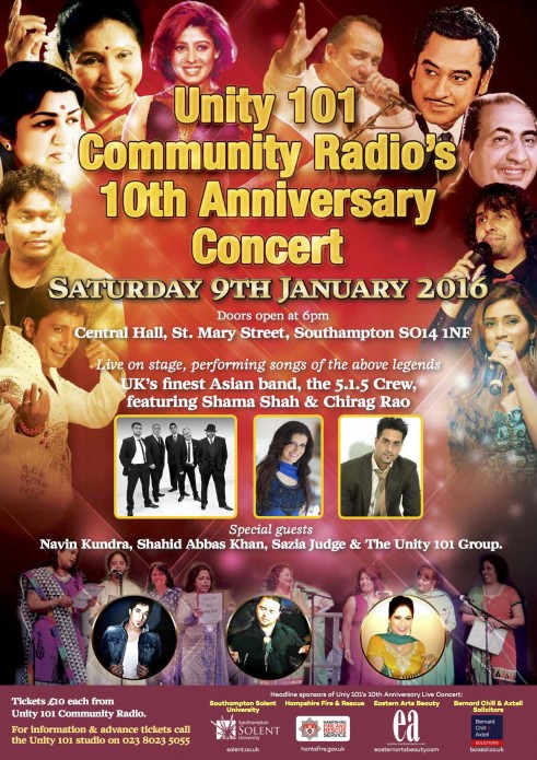 Unity 101 Community Radio’s 10th Anniversary Live Concert Saturday 9th January 2016, Central Hall. St. Mary Street, Southampton SO14 1NF
