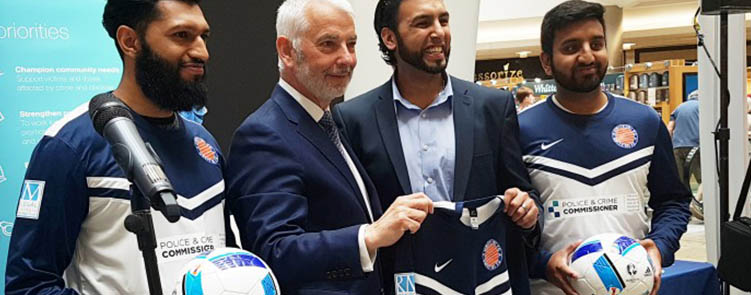The Police and Crime Commissioner, Michael Lane, at West Quay shopping centre Southampton, the official Unity 101 football club kit, to Naz Azram, the manager, who was joined by Ray and Zac, who are two other players of the team during the Safer Together partnership event.