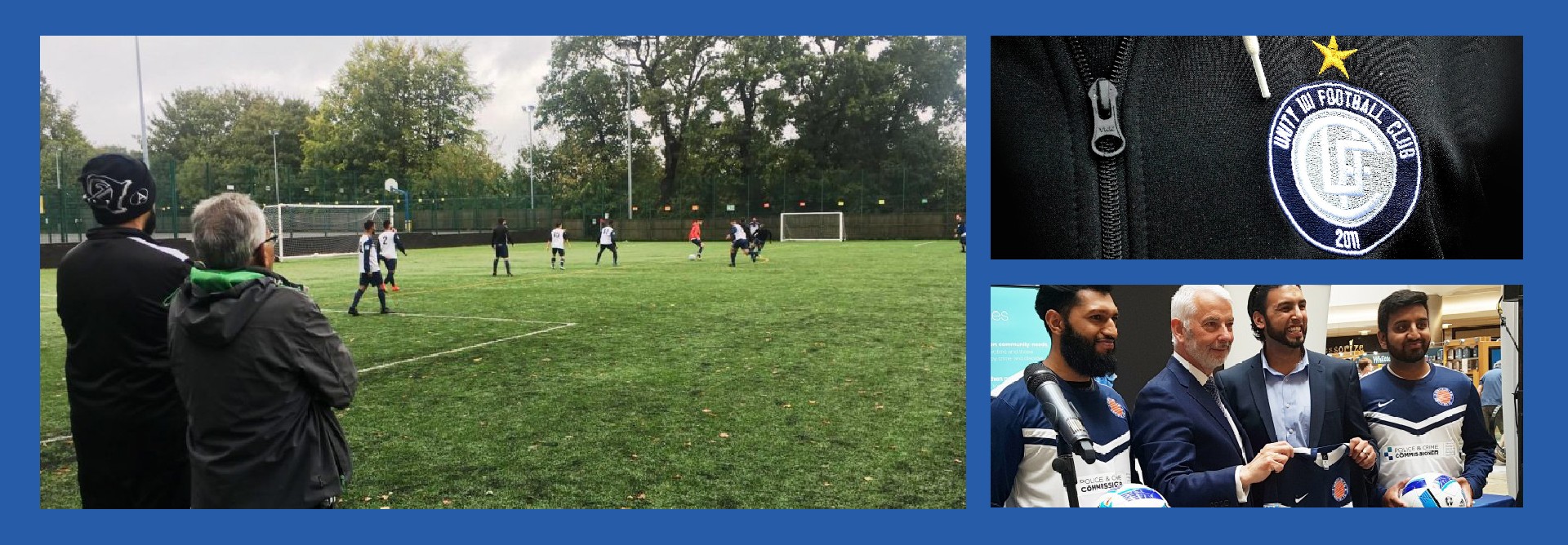 Unity 101 FC is sponsored by the Police and Crime Commissioner of Hampshire and the Isle of Wight and RM Legal Solicitors and supported by Cantell School. So please, Welcome on stage Michael Lane, Police and Crime Commissioner of Hampshire and Isle of Wight, Russell Mozumder, Managing Partner at RM Legal Solicitors LLP in Southampton, and finally Harry Kutty head teacher at Cantell School the home of Unity 101 FC ground. We would like to present the football shirts to Michael, Russell & Harry.